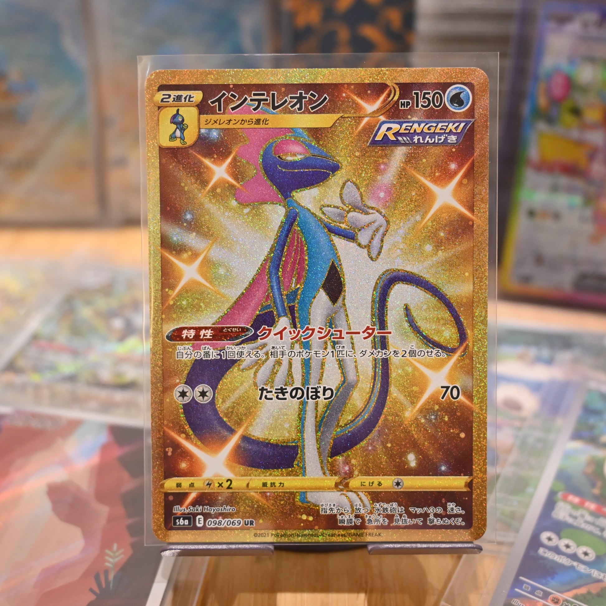 This card originates from the eighth generation of Pokémon (Sword/Shield series) and features the Shiny version of the Water-type starter, Inteleon, presented in a rare UR (Ultra Rare) version with a gold background. It is highly favored by players in battles due to its powerful support ability, and it is also considered a valuable collectible among collectors.