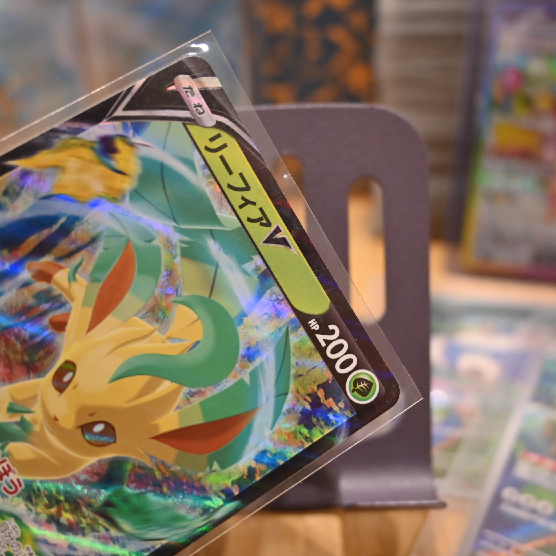 This Leafeon V card is included in the Japanese premium expansion pack "VSTAR Universe" (s12a) released in 2022. As a basic Grass-type Pokémon, it has 200 HP. Its ability, "Green Cell" (りょくかさいぼう), can be used once during your turn and ends the turn after use. It allows you to choose a Grass Energy card from your deck and attach it to one of your Pokémon. The attack "Leaf Blade" (リーフブレード) has a base damage of 90+, and if you flip a coin and it lands on heads, it adds an additional 60 damage.